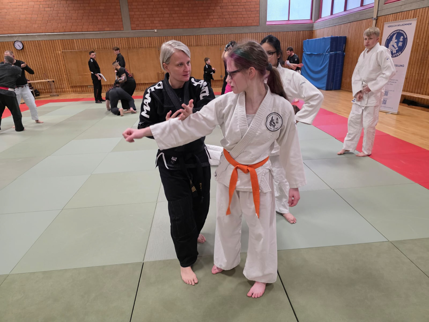 Blieb noch Zoe, diesmal die einzige, die sich als Erwachsene auf die Matte begab. Für den angestrebten Grüngurt musste sie zunächst eine Stufe der Goshin Jutsu Kata demonstrieren. An dieser Stelle sind stets besondere Konzentration und Kontrolle gefragt. Beides wurde geliefert, wodurch dem Übergang zu den weiteren Techniken nichts im Weg stand. Zoe demonstrierte unter anderem eine Hebelkette, die in Menge und Qualität deutlich über den Erwartungen lag und konnte auch darüber hinaus mit ihren Techniken deutlich überzeugen.