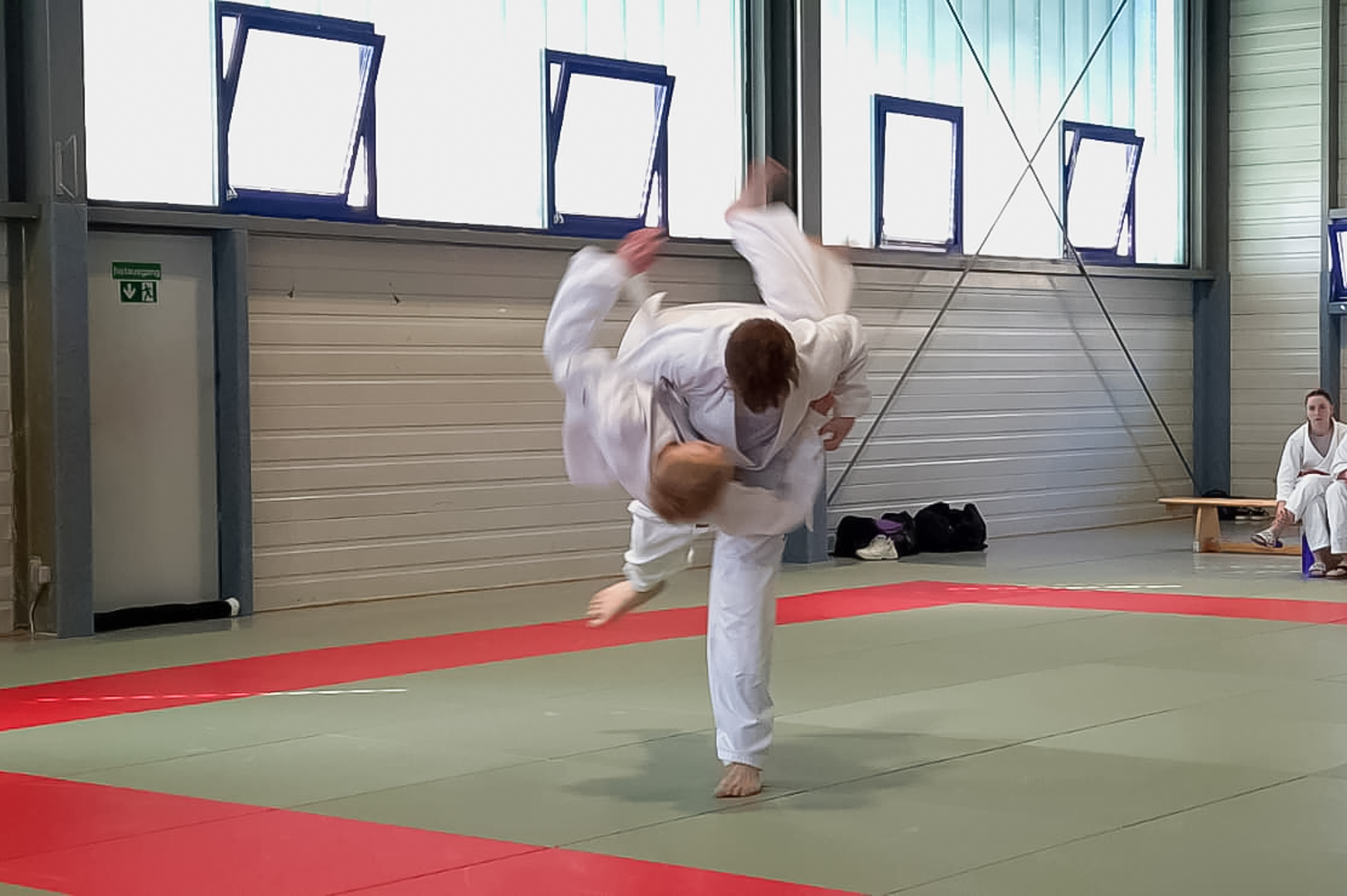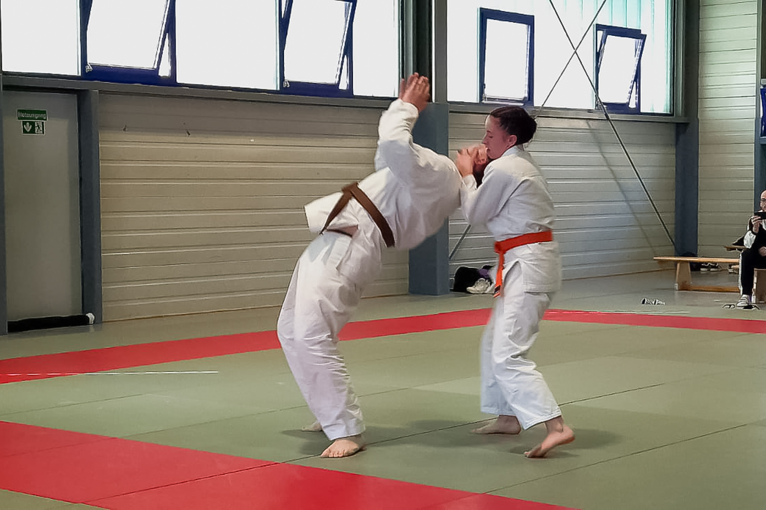 Blieb noch Zoe, diesmal die einzige, die sich als Erwachsene auf die Matte begab. Für den angestrebten Grüngurt musste sie zunächst eine Stufe der Goshin Jutsu Kata demonstrieren. An dieser Stelle sind stets besondere Konzentration und Kontrolle gefragt. Beides wurde geliefert, wodurch dem Übergang zu den weiteren Techniken nichts im Weg stand. Zoe demonstrierte unter anderem eine Hebelkette, die in Menge und Qualität deutlich über den Erwartungen lag und konnte auch darüber hinaus mit ihren Techniken deutlich überzeugen.