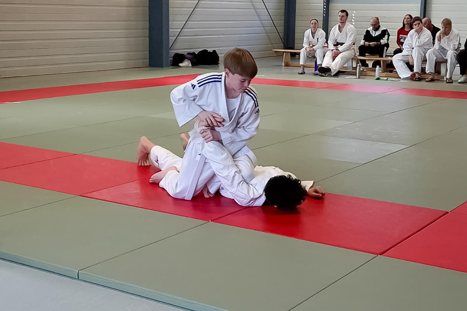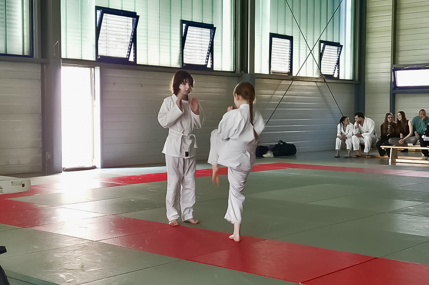 Zunächst durften die beiden Prüflinge der Kindergruppe vortreten und in aller Ruhe demonstrieren, was sie gelernt hatten. In so kleinem Rahmen war das höchstwahrscheinlich noch etwas aufregender als vermutet, aber beide machten ihre Sache souverän und bewiesen, dass sie sich die erste Farbe am Gürtel eindeutig verdient hatten.